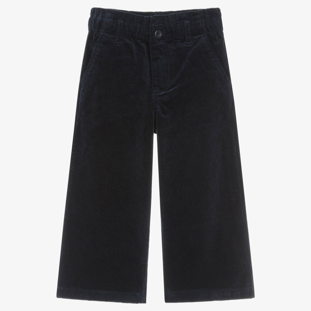 Navy blue cotton corduroy trousers for girls by American brand Ralph Lauren. In a wide leg style with a slight stretch, they are soft and comfortable, with a feminine frill around the elasticated waist and useful pockets on both the front and back. They fasten with a button and zip on the front.