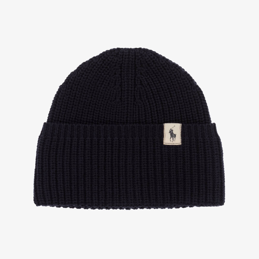 Navy blue beanie hat for girls by Ralph Lauren, knitted in soft, mid-weight ribbed cotton. Cosy and warm, it has a wide turned-up brim with a blue and ivory logo patch on the front for a subtle designer finish.