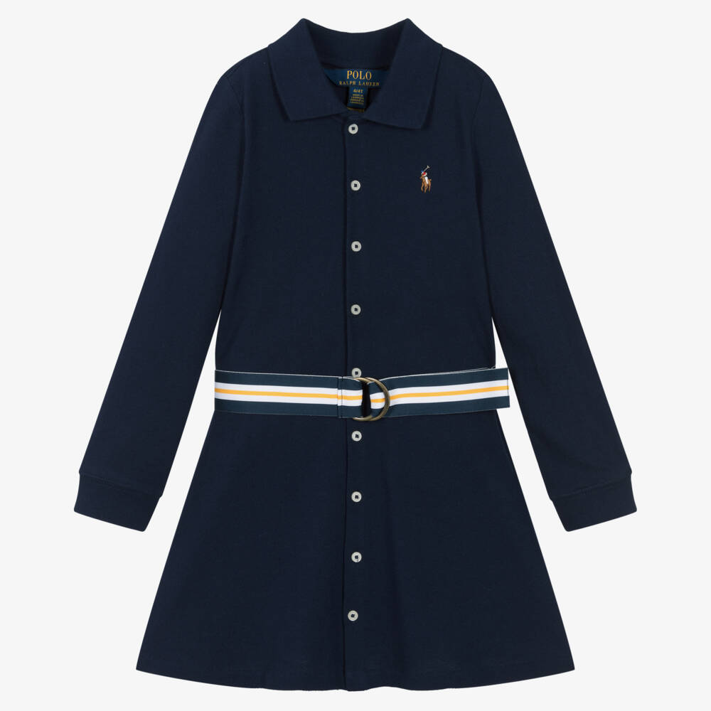 Navy blue long-sleeved polo shirt dress for girls by Ralph Lauren, made in soft and comfortable cotton piqué. A ribbed collar and cuffs, branded button fastenings and an embroidered pony logo on the chest, give this lovely dress a sporty feel. It comes with a detachable striped belt, that adjusts with a branded metal D-ring.