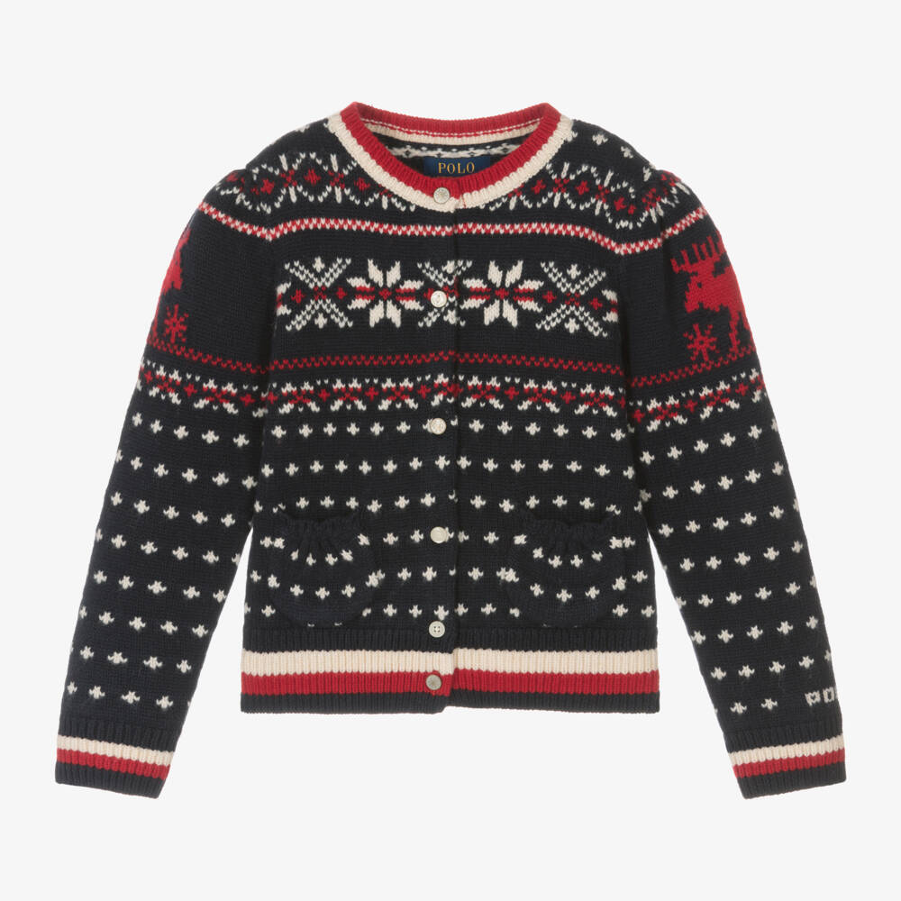 A gorgeous navy blue cardigan for girls by Ralph Lauren, knitted in a cosy cotton and wool blend with small front pockets. Ideal for the festive season it is designed with a red and ivory Fair Isle pattern, featuring reindeer on the sleeves and an intarsia logo on one cuff for a subtle designer touch.