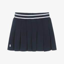 Navy blue skort for girls by Ralph Lauren, with an embroidered white Pony logo for a distinctive designer look. Made in soft jersey, this sporty style has a full, pleated skirt with concealed shorts underneath, making it ideal for active wear. An easy, pull-on style, it has a ribbed, elasticated waistband patterned with contrasting white stripes.