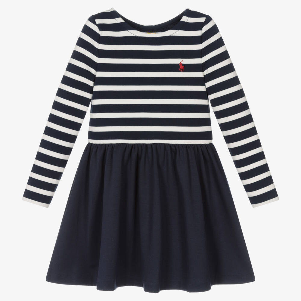 Girls classic navy blue and white striped dress by Polo Ralph Lauren. Nautically inspired, this easy-to-wear design is made in a stretchy viscose blend jersey, with a fitted bodice and a gathered, loose-fitting skirt.