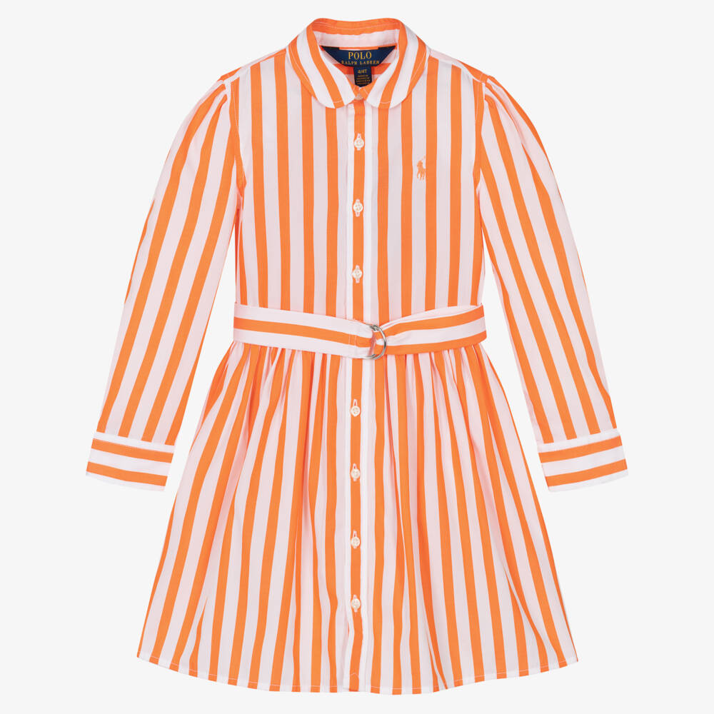 Pretty smart-casual orange and white striped shirt dress for girls by Ralph Lauren. Woven in lightweight cotton poplin, it has the brand's signature pony logo embroidered on the chest in pale orange. Button fastening, it has discreet side seam pockets, and there is a matching detachable belt, which can be adjusted, for a stylish silhouette.