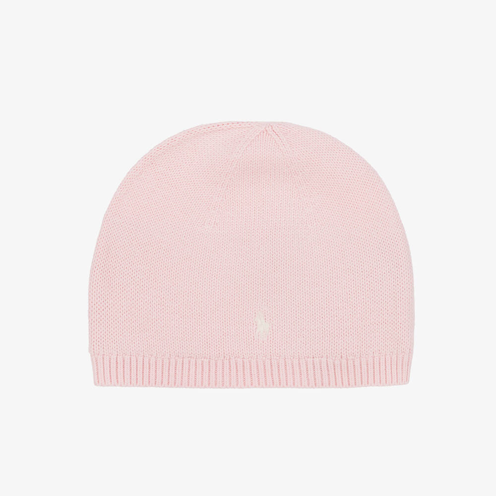 Pale pink beanie hat for girls, knitted in soft cotton. This cosy hat is lined in soft polar fleece for extra warmth and has a neat ribbed brim. The brand's signature pony logo is embroidered on the front in white for a subtle designer finish.