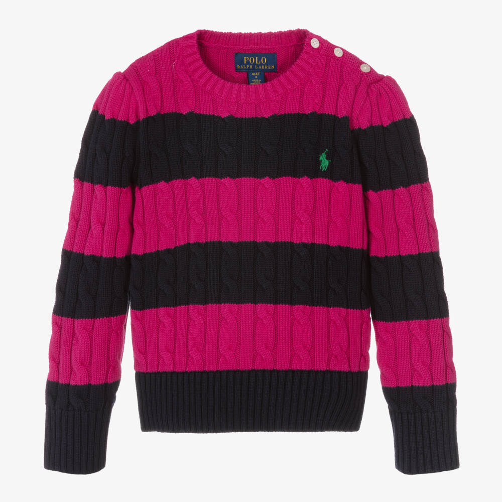 A fuchsia pink and navy blue sweater for girls by Ralph Lauren. It is made in a beautifully soft cotton knit, with a smart cable pattern for that classic preppy look. The American brand's signature pony logo is embroidered on the front in green for added designer appeal. Smaller sizes have branded button fastenings on one shoulder to help with over-the-head dressing.