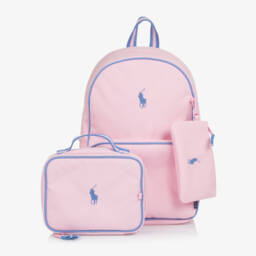 This pale pink backpack for girls by Ralph Lauren comes with a useful lunch box and pencil case, ideal for taking to school, as well as weekend adventures. This roomy set is made in sturdy, hard-wearing canvas, with the signature pony logo embroidered on each piece in pale blue, matching the trims. The backpack has a top handle, adjustable shoulder straps, an interior laptop sleeve and a side water bottle pocket. The lunch box has an insulated, wipe-clean lining and a mesh side pocket. It can be stored in the front pocket of the backpack.