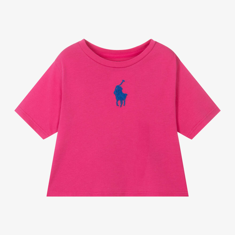 A fuchsia pink T-shirt for girls from Ralph Lauren, made in soft cotton jersey. In a cool, boxy fit style with short sleeves, this comfortable tee has the instantly recognisable Big Pony motif on the front in blue French knot embroidery.