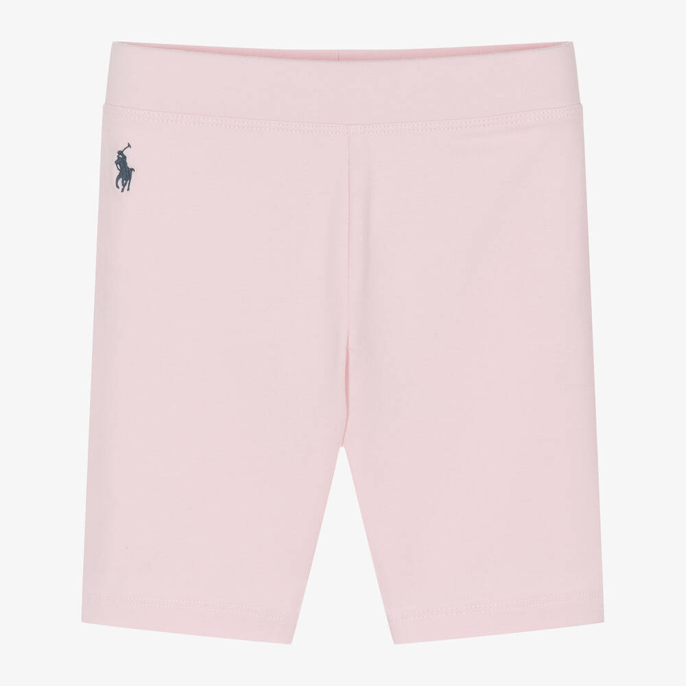 Light pink cycling shorts for girls by Ralph Lauren, made in comfortable cotton jersey. Soft and stretchy, these slim-fitting shorts have an elasticated waistband and a dark blue pony logo embroidered on the front.