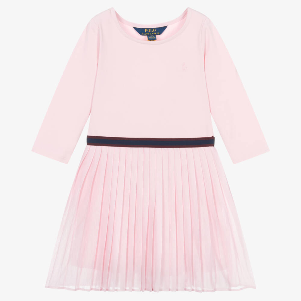 Pale pink dress for girls by Ralph Lauren, with a stretchy striped waistband in navy blue and burgundy red. Suitable for both smart and casualwear, this simple yet elegant style has a cotton jersey bodice and a lightweight pleated skirt. The neckline is gently rounded and skirt is lined in jersey for extra comfort. The brand's small pony logo is embroidered on the chest for a signature finish.