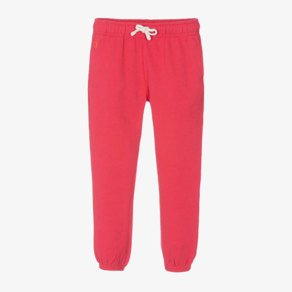 Bright pink cotton joggers for girls by American designer Ralph Lauren, with the brand's signature pony logo embroidered on one side in orange. Ideal for relaxed days, they are made in comfortable, lightweight jersey with a warm, fleecy inside. They have a white drawstring on the waistband for a good fit, ribbed cuffs to keep ankles cosy and useful concealed side pockets.