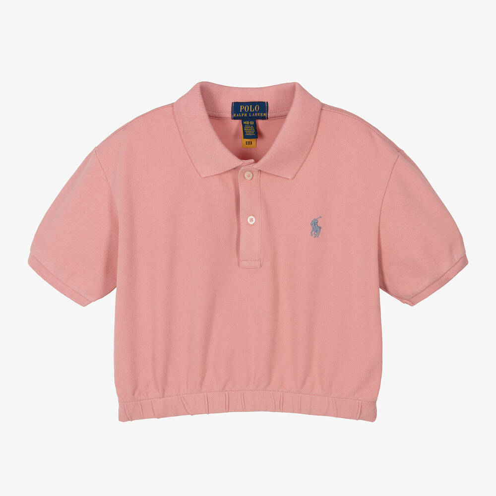 Pink polo shirt for girls from Ralph Lauren, with the signature pony logo embroidered in blue on the chest. A playful update on the American brand's classic style, it has a boxy silhouette and an elasticated hem to sit on the waist. Ribbing on the collar and cuffs, and branded button fastenings complete the style.