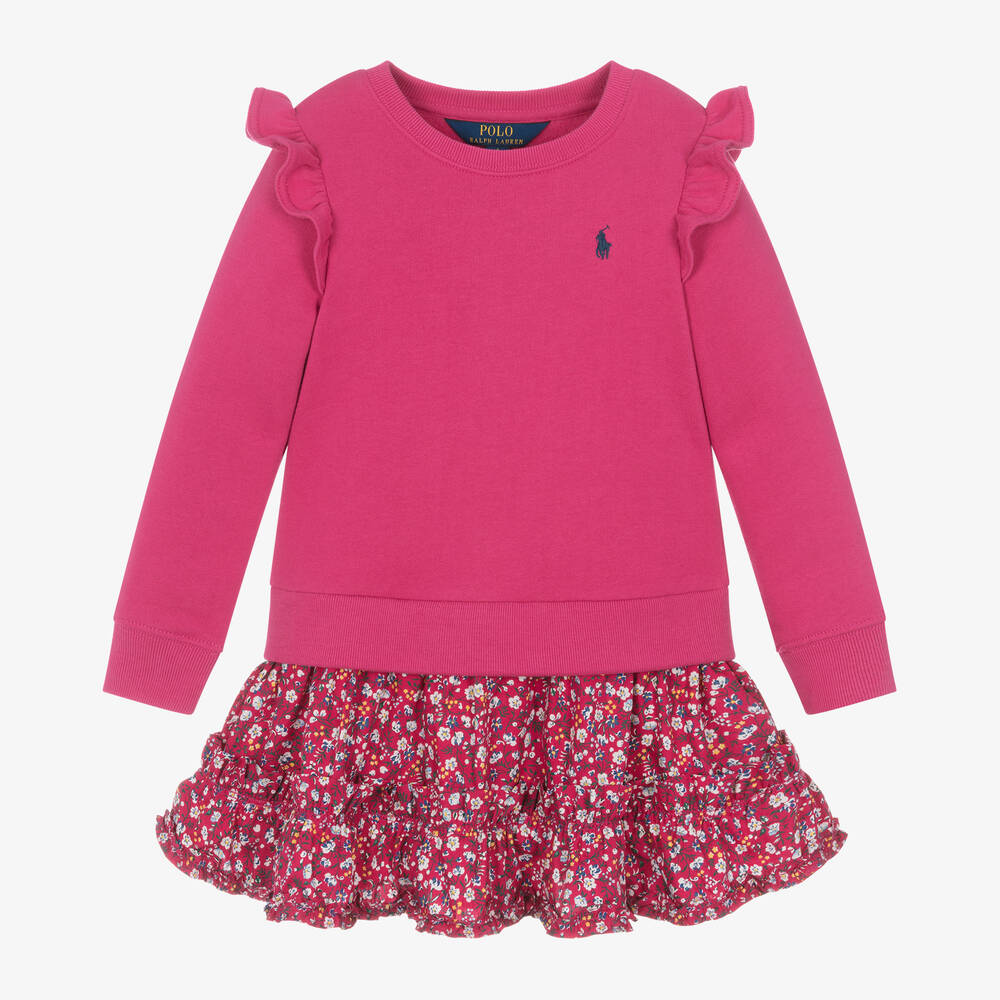A lovely fuchsia pink cotton dress for younger girls by Ralph Lauren, designed to look like two pieces. In a sweatshirt style, the upper part is warm and fleecy on the inside, with stretchy ribbed trims and pretty ruffles over the shoulders. The signature pony logo is embroidered in navy blue on the chest. With a pretty blue and white floral print, the attached poplin skirt is designed with a frilled hem for a sweet finish.