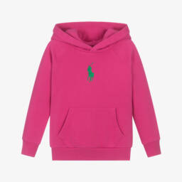 Casual and comfortable for girls, this pink hoodie is by Ralph Lauren. Made in a soft cotton-blend, it has raglan sleeves and a hand-warmer pouch pocket on the front. A multicolour embroidered Big Pony logo adds designer appeal.