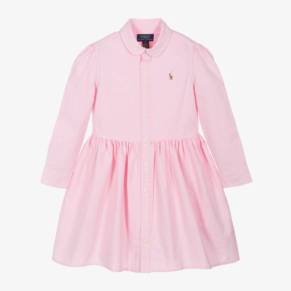 A preppy pink, Oxford cotton shirt dress for girls by Ralph Lauren, with the American brand's signature pony logo embroidered on the front. Washed for added softness, this charming design buttons through the front and is styled with a collar, puffed sleeves and a gathered skirt. Hidden side seam pockets add a practical touch.