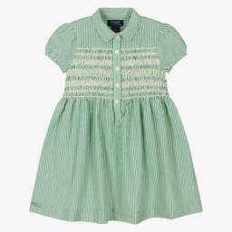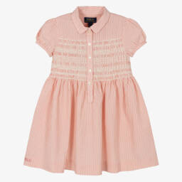A delightful pink striped dress for little girls by Ralph Lauren, made in lightweight cotton seersucker. Lovely for the warmer months, this sweet, timeless style has a gently shirred bodice with embroidered detailing and pretty puffed sleeves. Fastening neatly with buttons, it has a classic collar and gathered skirt, with an embroidered Polo logo at the hem, adding a signature finish.