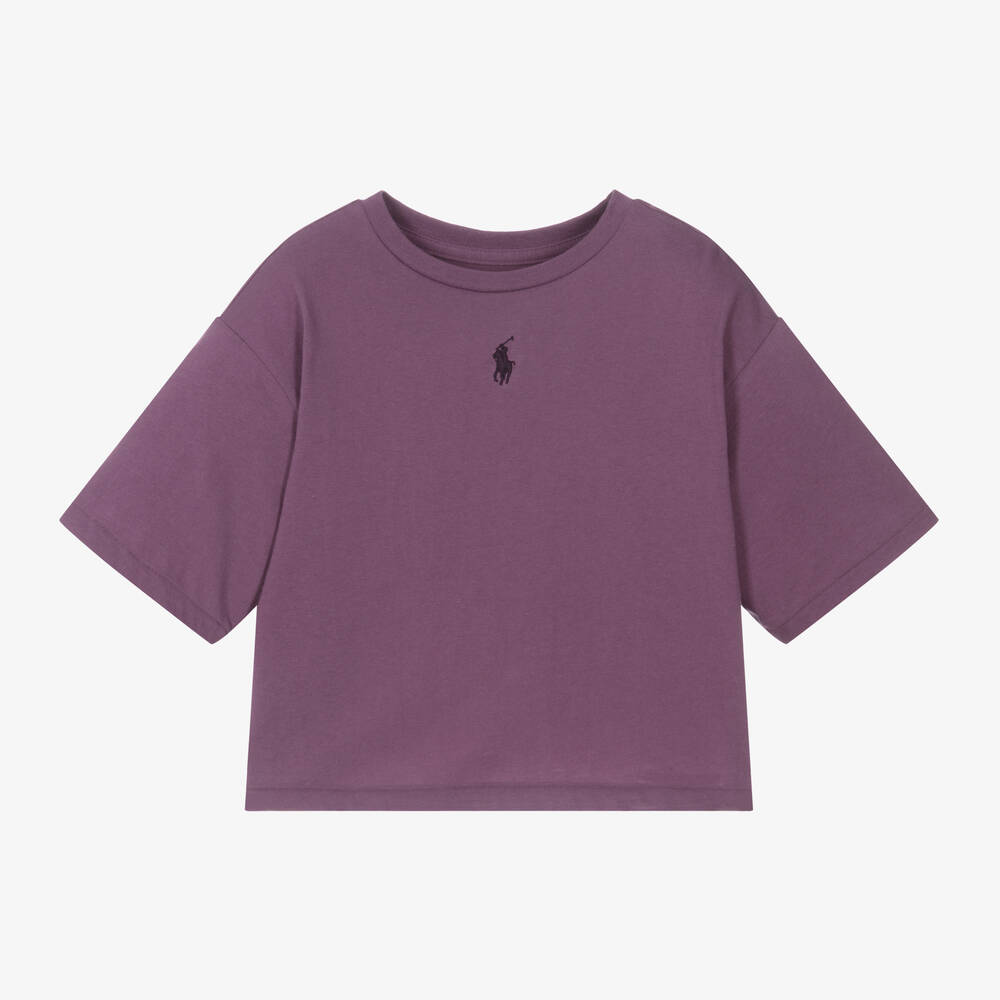 Purple T-shirt for girls by Ralph Lauren, made in soft cotton jersey. Designed in a relaxed, boxy fit, this casual crew neck top has the brand's signature pony logo embroidered in tonal purple on the front.