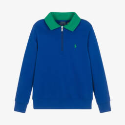 Purple cotton jersey zip-up top for girls by Ralph Lauren. Relaxed and comfortable, it has a stand-up collar with a half zip fastening and a useful pouch pocket on the front. Zips on the side seams can be opened for ease of movement. The brand's signature pony logo is embroidered in tonal purple on one side.