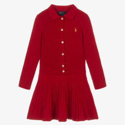 A red cotton skirt set for girls by Ralph Lauren, softly knitted in a classic cable stitch. The cardigan fastens with buttons on the front and has a small navy blue embroidered pony logo on the chest. The skirt is gently flared and has a stretchy ribbed waistband for a comfortable fit.