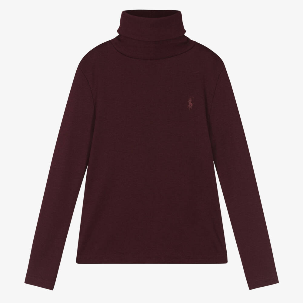 Burgundy red roll neck sweater for girls by American brand Ralph Lauren. Made in a super soft and comfortable, cotton and modal blend jersey, it is ideal for layering on chilly days. The designer's signature pony logo is embroidered on one side.