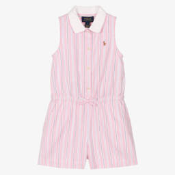 Red playsuit for girls by Ralph Lauren, with an all-over sailboat print in navy blue and ivory. Woven in soft cotton, this fun playsuit fastens with buttons down one side and has a stylish open back with a charming bow detail. The shoulder straps are adjustable for an ideal fit, and there are patch pockets on the front, with a tonal embroidered logo to finish.