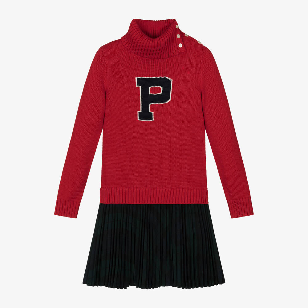 Girls varsity-style sweater dress by Ralph Lauren, with the look of a two-piece. The red, knitted cotton top part has an intarsia, letterman-inspired "P" in navy blue, with button fastenings on the ribbed polo neck. The pleated, viscose-blend, twill skirt has a green and blue tartan pattern.