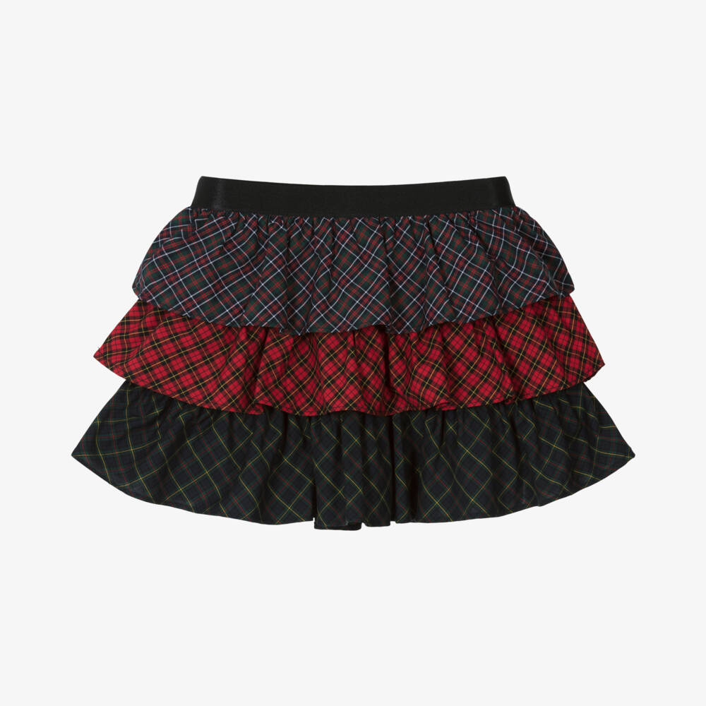In shades of red, navy blue, and green, this tiered skirt for girls by Ralph Lauren has three different plaid patterns. Made from lightweight cotton and partially lined, this charming skirt has a black elasticated waistband for a comfortable fit.