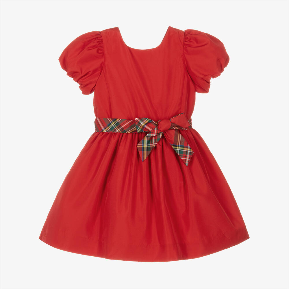 Lovely red dress for girls by Ralph Lauren, trimmed with a heritage tartan belt around the waist. The fitted bodice has puffed sleeves and a simplistic design, flowing beautifully into the voluminous, lined skirt. Fabric-covered buttons on the back fastens the style with elegance.