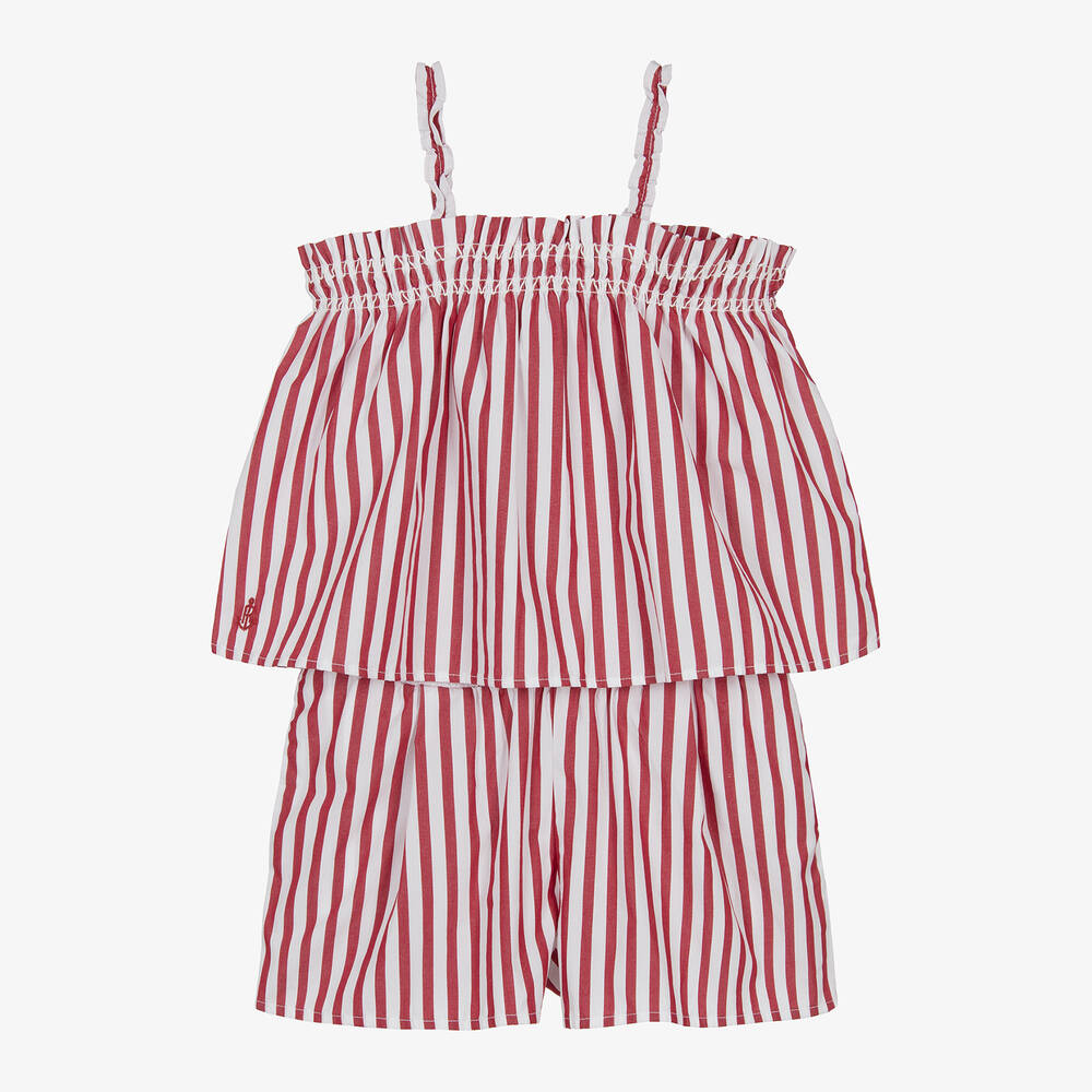 Just right for warmer days, this red and white striped shorts set for girls is by American brand Ralph Lauren. Made in cool, lightweight, cotton poplin, the sleeveless top has a frilled, shirred trim and matching, frilly shoulder straps. An anchor logo is embroidered in red by the hem. The coordinating shorts have a frilled, elasticated waistband for a comfortable fit and useful, side seam pockets.