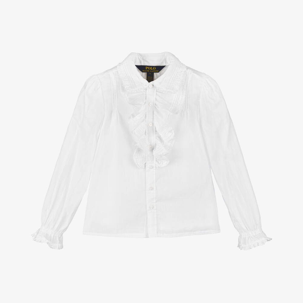 Beautiful sheer white cotton voile blouse for girls by Ralph Lauren, with lace-trimmed ruffles on the front. It has pin-tuck detailing and pretty puffed sleeves with gently elasticated cuffs, as well as an attached jersey vest for modesty.