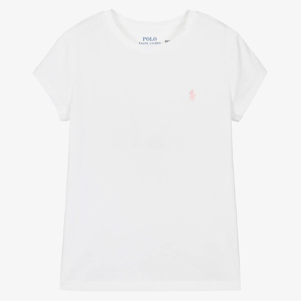 White T-shirt for girls by Ralph Lauren, made in comfortable cotton jersey. It has a small pale pink pony logo embroidered on the chest for a signature finish.
