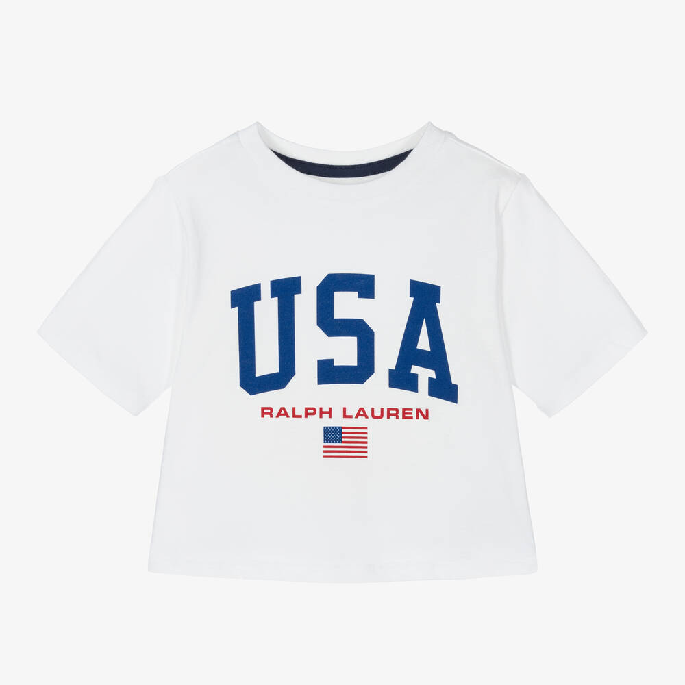 White short-sleeved T-shirt for girls by Ralph Lauren, made in soft cotton jersey. In a modern boxy fit, this casual top has a cool USA logo design on the front in blue and red for a stylish designer look.