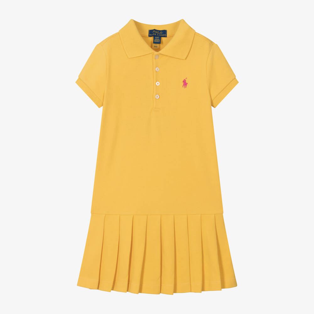 A bright yellow dress for girls by Ralph Lauren, made in soft and comfortable cotton piqué. In classic polo shirt styling, it has a ribbed collar and button fastenings, with a dropped waist and pleated skirt adding to the sporty vibe. The signature pony logo is embroidered in pink on the chest for a distinctive designer finish.