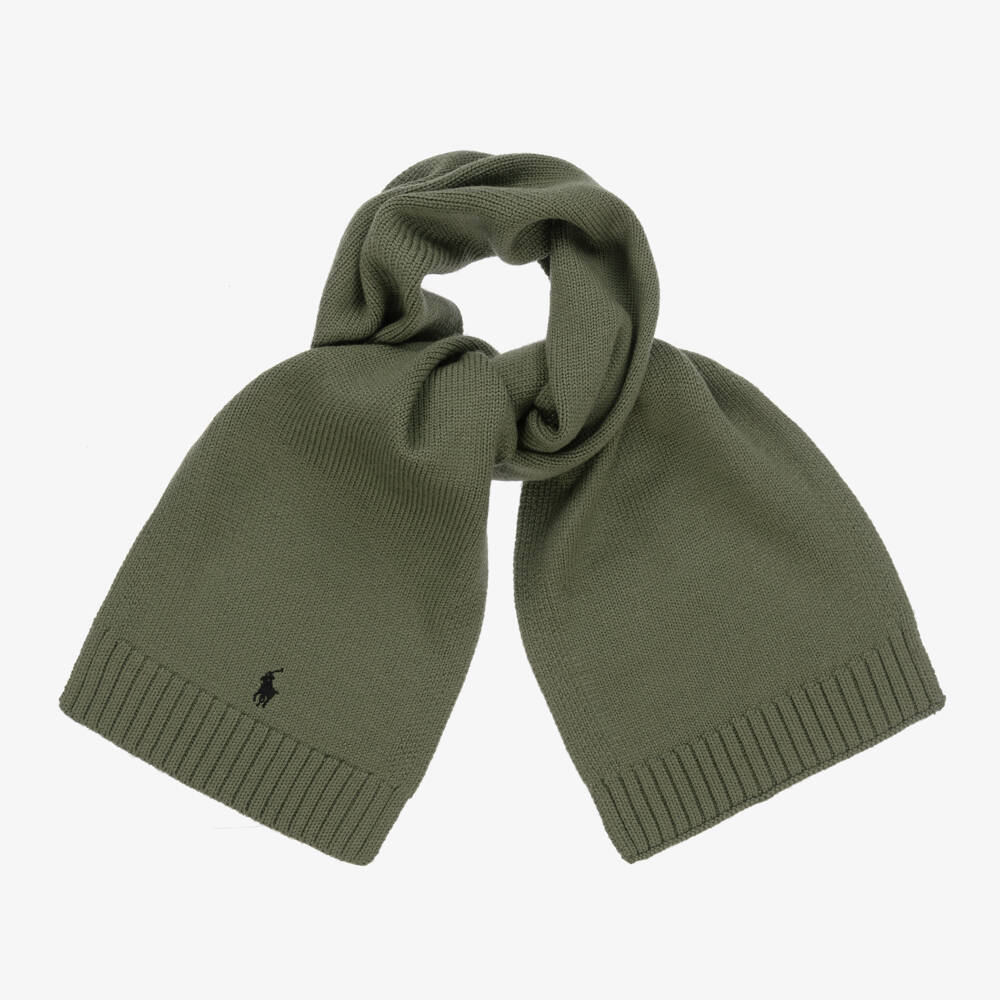 A green scarf for boys and girls by Ralph Lauren, made from a soft wool knit with ribbed trims. Simply styled, there is a signature black pony logo embroidered on one side for a subtle designer finish.