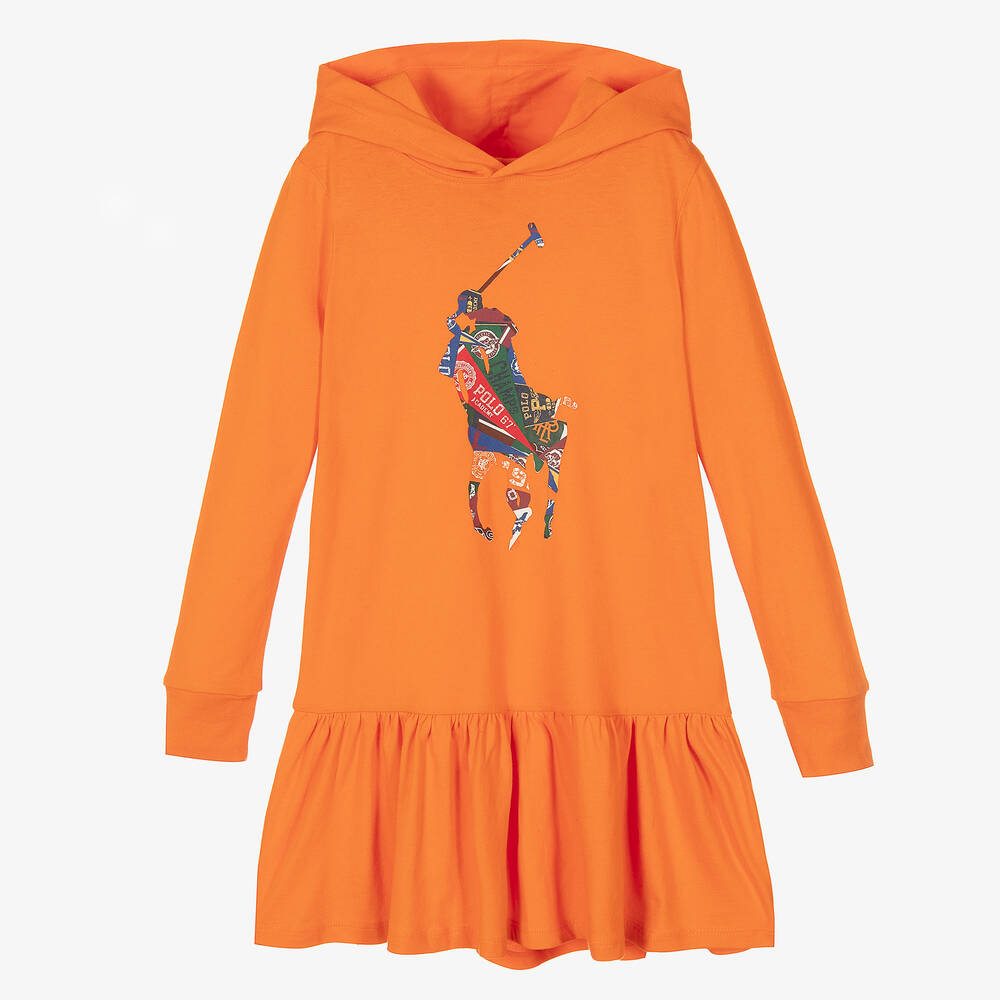 Bright orange hooded sweatshirt dress for girls by Polo Ralph Lauren, made in lightweight cotton jersey. This casual dress revolves around a bold Big Pony logo front on the front, patterned with green, blue, and red logo flags.
