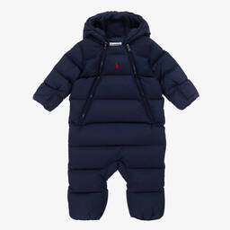 Pink puffer snowsuit for baby girls by Ralph Lauren, with a cosy fleece-lined hood. Warmly padded in soft down, it is made in a smooth, water-repellent fabric, with a silky soft lining. It has a double zip fastening on the front, along with a tonal pony logo for a subtle designer look. For an extra snug feel, there are fold-over cuffs on the hands and feet.