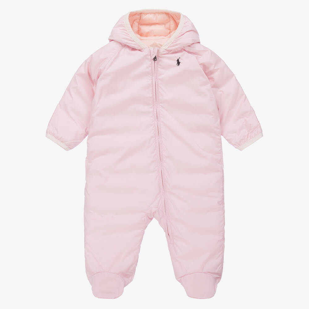 A classic pale pink padded snowsuit for baby girls by Ralph Lauren. Silky smooth with a footed silhouette, it has a branded front zip fastening to keep your little one warm and cosy. The Signature pony logo can be found on the chest in navy blue for an iconic finish.