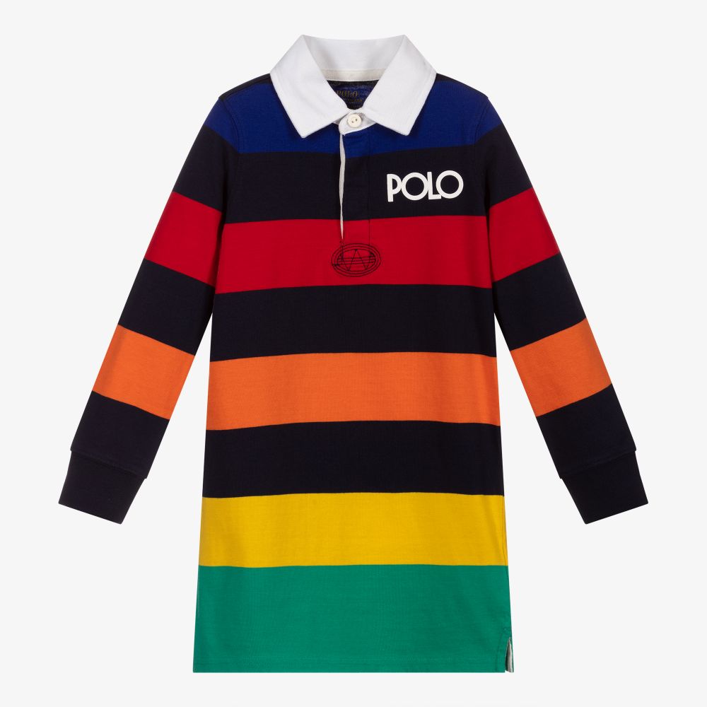 Rainbow striped dress for girls, by Polo Ralph Lauren. Made from soft cotton jersey, it has a white logo print and a smart collar.