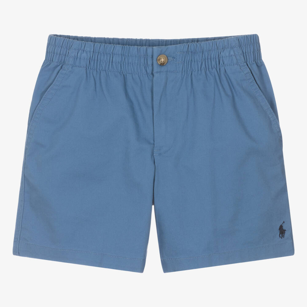 From Ralph Lauren, a pair of stylish blue chino shorts for teen boys, with the brand's signature pony logo embroidered in navy blue on one leg. Styled with useful pockets on both the front and back, they fasten with a button and zip and have internal drawstrings to ensure a great fit. They are made in stretchy cotton twill with wrinkle and abrasion-resistant technology for comfortable wear.