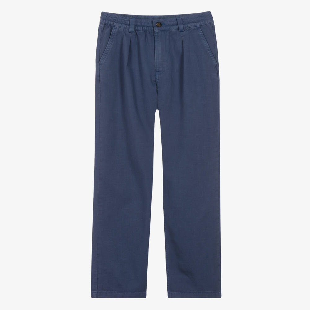 Washed navy blue trousers for teen boys from Ralph Lauren, in a casual chino style with an embroidered signature pony logo on the back. Made in soft cotton twill, they fasten with a zip and button and have an elasticated waistband with an internal drawstring tie. Pleats on the front give a comfortable relaxed fit and they have slanted front pockets and a single patch pocket on the back.