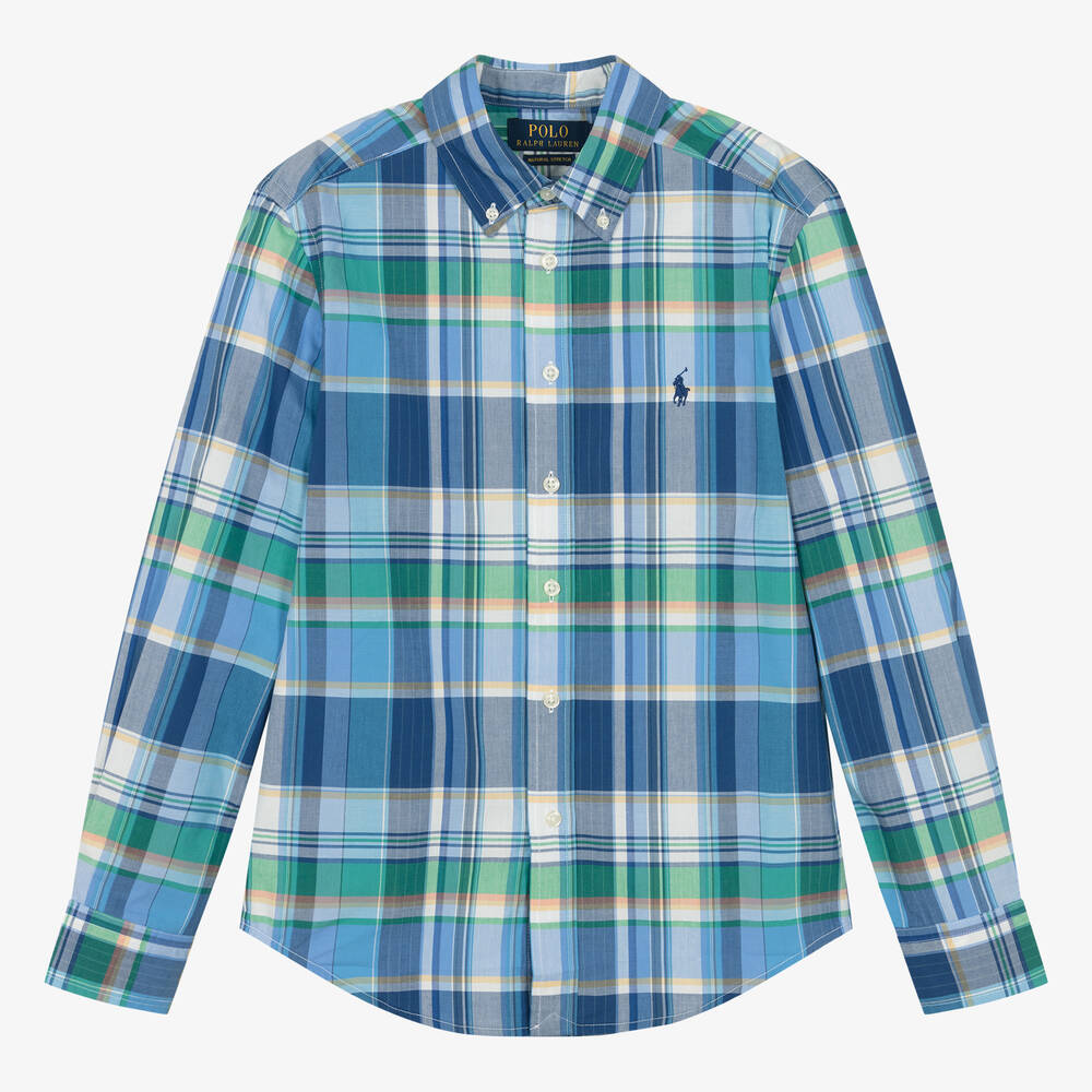Smart-casual shirt for teen boys by Ralph Lauren, in a blue and green checked pattern. For instant designer appeal, it has the American brand's signature pony logo embroidered in navy blue on the chest. Made in comfortable, lightweight poplin, this long-sleeved style has a button-down collar and a shaped hem.