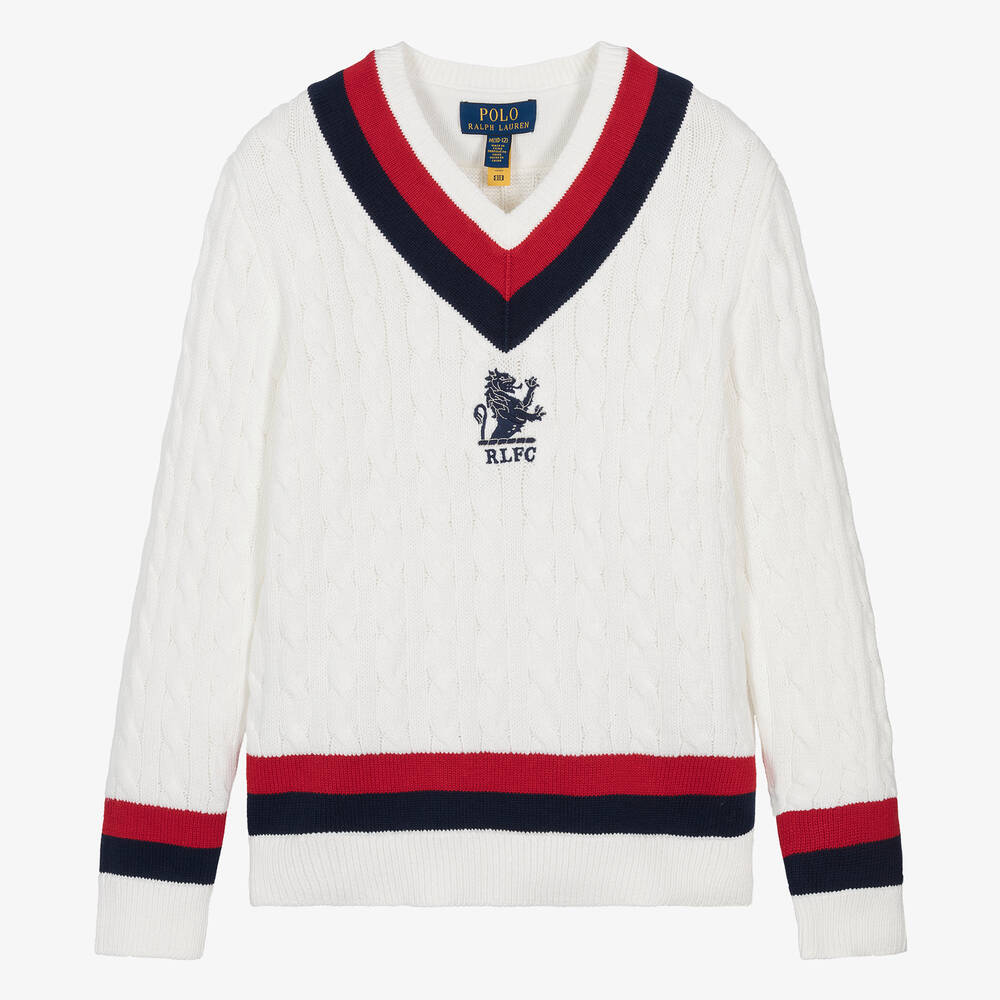 Inspired by the adult collection, this preppy ivory V-neck cricket sweater for teen boys is designed by Ralph Lauren. A collegiate-inspired lion emblem with 'R.L.F.C' adds a sporty feel to the layering piece, alongside navy blue and red stripes on the neckline, the long sleeves and the hem. It is knitted in soft cotton with a timeless cable knit design.