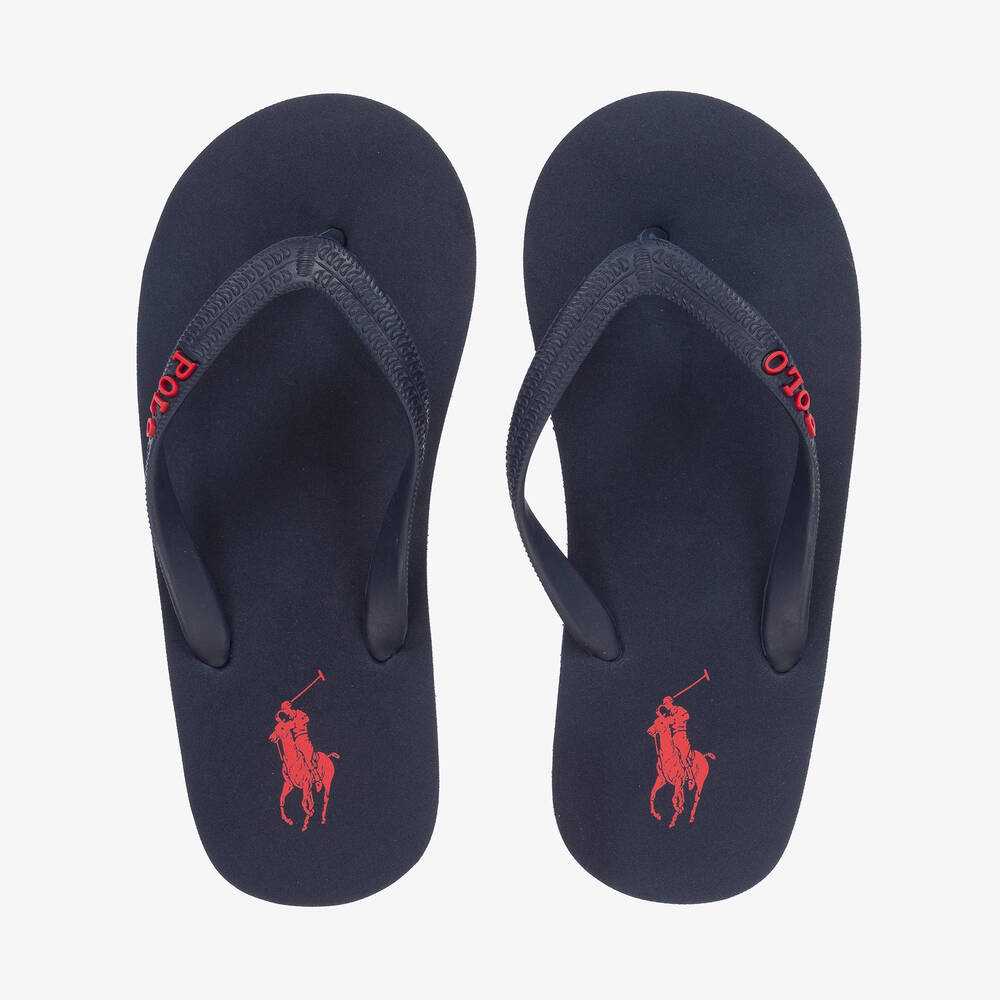 Navy blue flip-flops for teen boys by American brand Ralph Lauren. They have an embossed strap with raised red logo lettering to one side. The smooth insole is printed with the brand's signature red Big Pony logo and embossed Big Pony logos can be seen on the soles. The midsole has a narrow red stripe all around for a sporty touch.