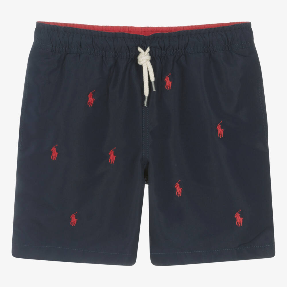 Navy blue swim shorts for teen boys by Ralph Lauren, ideal for achieving a logo-inspired, poolside look. Embroidered with the brand's signature pony logo on the front and back in red, this beach-bound style has a drawstring waist and concealed side seam pockets. Lined in breathable mesh for comfort, they are made using recycled materials for a positive eco finish.