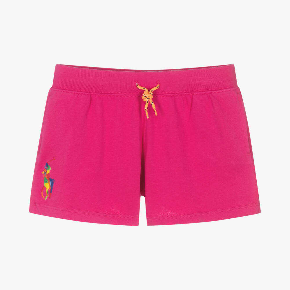 Fuchsia pink shorts for teen girls by Ralph Lauren, with a Big Pony logo embroidered on one leg in vibrant multicolours. From a collection of timeless styles, these casual shorts are made in lightweight, cotton sweatshirt jersey with handy pockets on the seams. They have an elasticated waist with drawstring ties for a preferable fit.