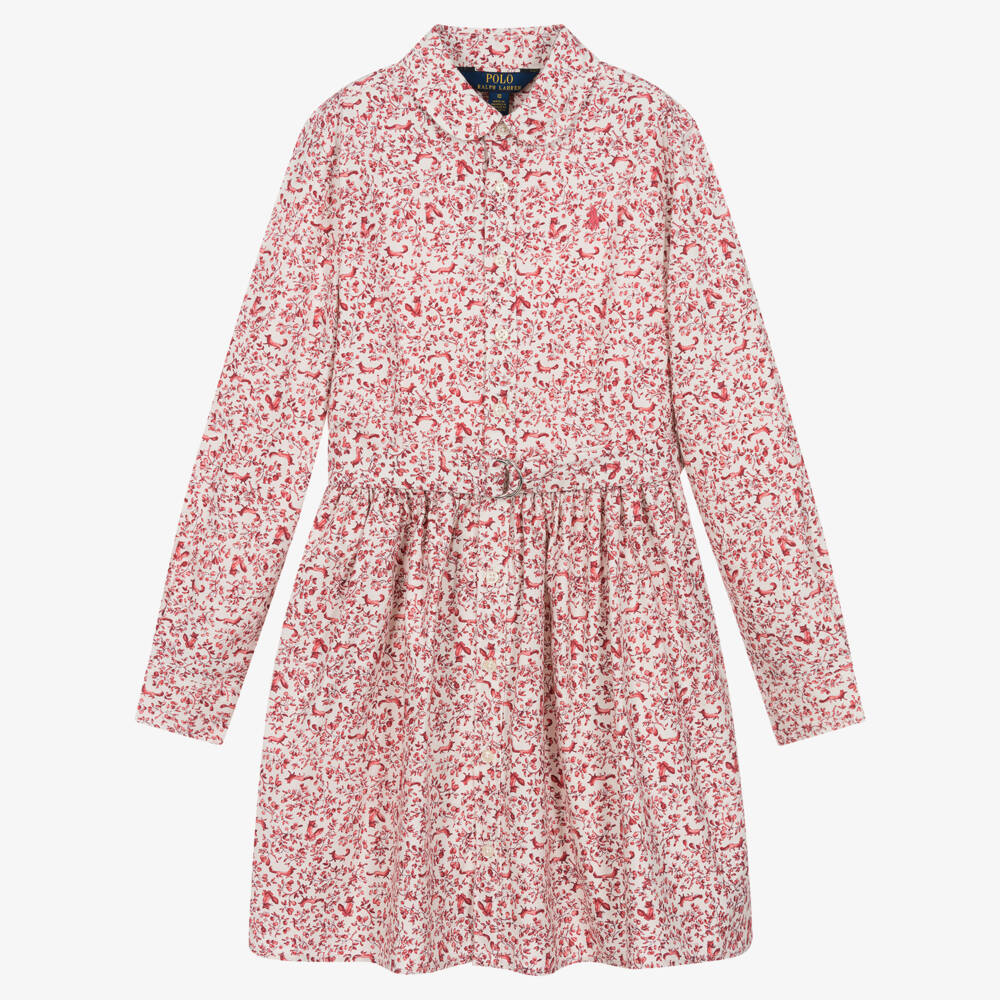 A casual pink dress for teen girls by Ralph Lauren, embroidered with a signature pony logo on the chest. Woodland-themed, the striking floral print incorporates fruit and fox motifs against a contrasting white background. It is styled with a round collar and useful side pockets that are neatly concealed on the seam. Woven from soft Oxford cotton, the dress has front button fastenings and a detachable D-ring belt on the waistline.