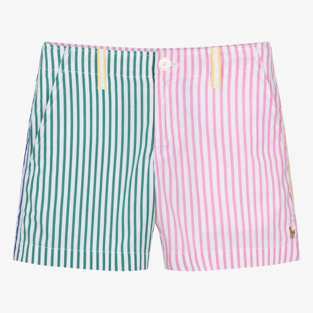 Pink striped shorts for teen girls by Ralph Lauren, embroidered with the signature pony logo on one leg. Smart and preppy, they are recognisably by the American designer. There are slanted pockets on the front and button fastening pockets on the back. Softly woven in cotton poplin, they fasten simply with a button and zip on the front.
