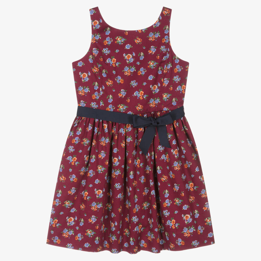 In a sophisticated floral pattern, this burgundy red cotton dress for teen girls is by Ralph Lauren. It has a fitted bodice and flared skirt, with a navy blue grosgrain belt for a feminine silhouette. Fastening with buttons, there are pockets concealed in the side seams.