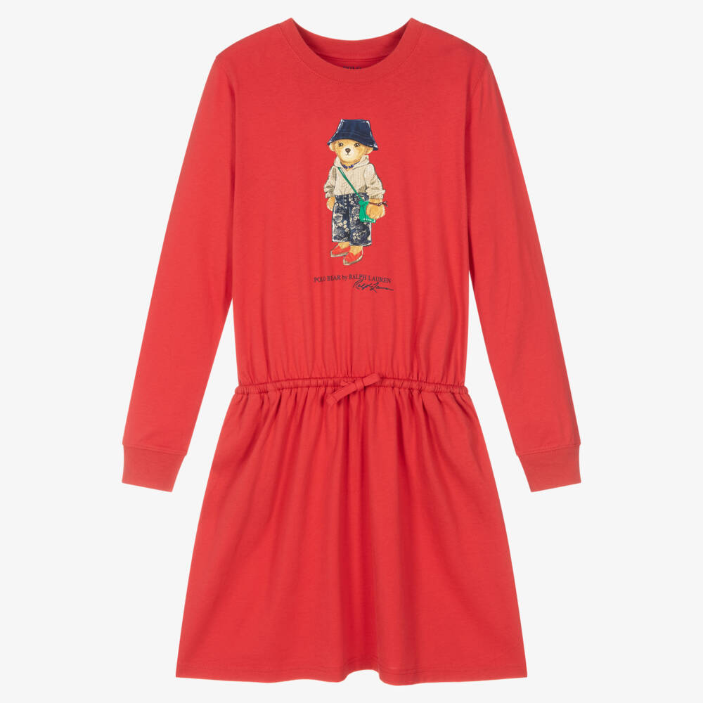Teen girls casual red dress from Ralph Lauren, featuring the iconic Polo Bear for instant recognition. An easy-to-wear design, this cotton jersey dress has a drawstring waist, side seam pockets and soft ribbed trims.