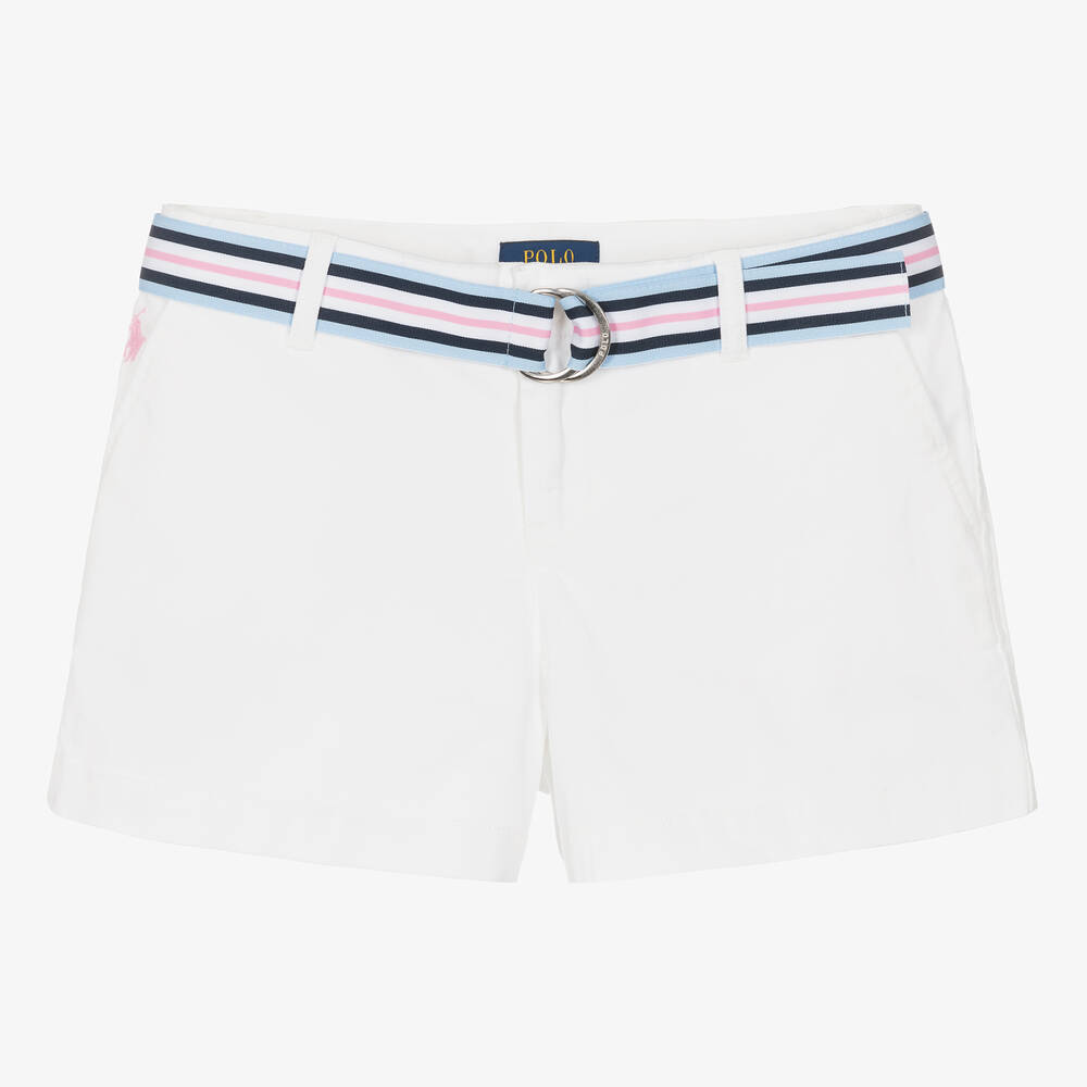 White chino shorts for teen girls by Ralph Lauren, with the brand's signature pony logo embroidered in pink on the hip. Made in cotton twill with refined stretch for superior comfort and wrinkle resistance, they have zip and button fastenings and four-pocket styling. A retro woven logo label can be seen on the back and they come with a D-ring web belt, striped in blue, white and pink to complete the look.