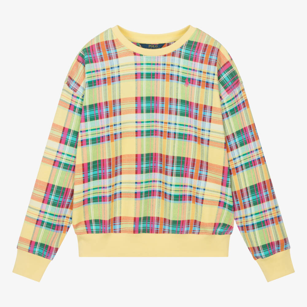 From American brand Ralph Lauren, a lightweight yellow sweatshirt for teen girls with gorgeous pink, green and blue checks. It is embroidered on the chest with the signature pony logo in pink, for a distinctive designer touch. Just right for elevating her casual looks, this comfortable cotton-blend jersey top has a relaxed fit with drop-shoulder long sleeves and ribbed trims.